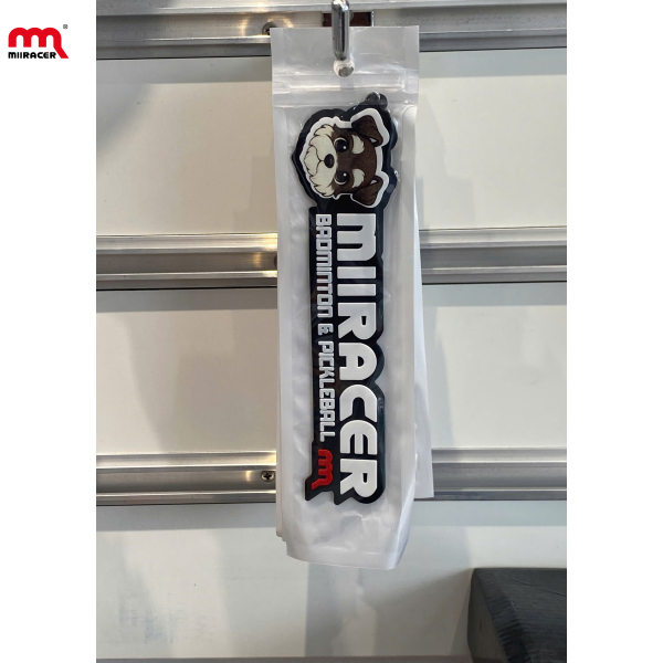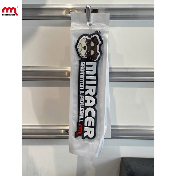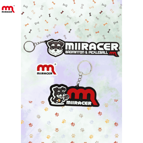 Thiết kế dáng dài nổi bật: Hình chú chó đáng yêu (Bara Mascot) ở đầu móc khóa với biểu cảm vui tươi. Chữ MIIRACER in lớn nổi bật, phía dưới là dòng chữ phụ: BADMINTON & PICKLEBALL – thể hiện lĩnh vực chuyên môn của thương hiệu. Biểu tượng "m đỏ" quen thuộc xuất hiện ở góc cuối, tăng độ nhận diện thương hiệu.