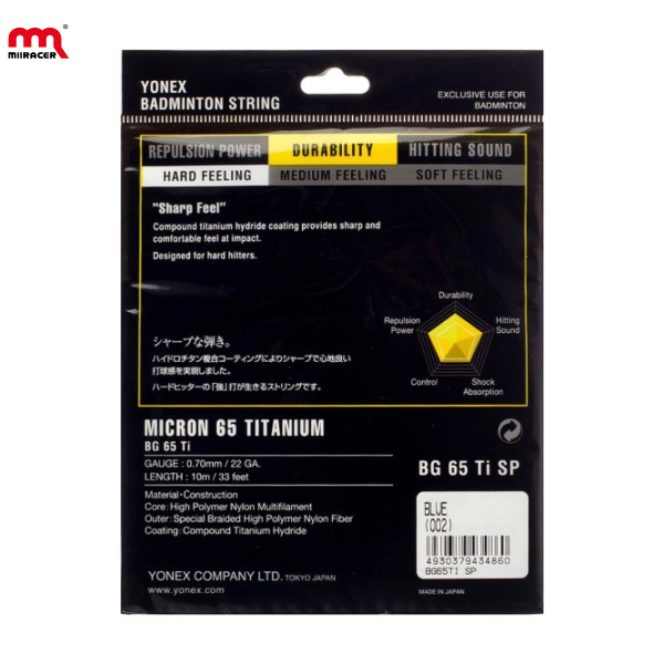 - Dây cước căng vợt Yonex BG 65 TITANIUM là loại cước căng vợt quá quen thuộc trong giới cầu lông Việt Nam hiện nay. Sau sự thành công của BG 65, Yonex đã có một nâng cấp nhỏ phù hợp với mong muốn của người chơi cầu lông phong trào chính là phủ thêm một lớp Titan làm tăng độ nảy, cho âm thanh nổ cầu lớn hơn nhưng vẫn được xếp vào loại cước đan vợt bền của Yonex.